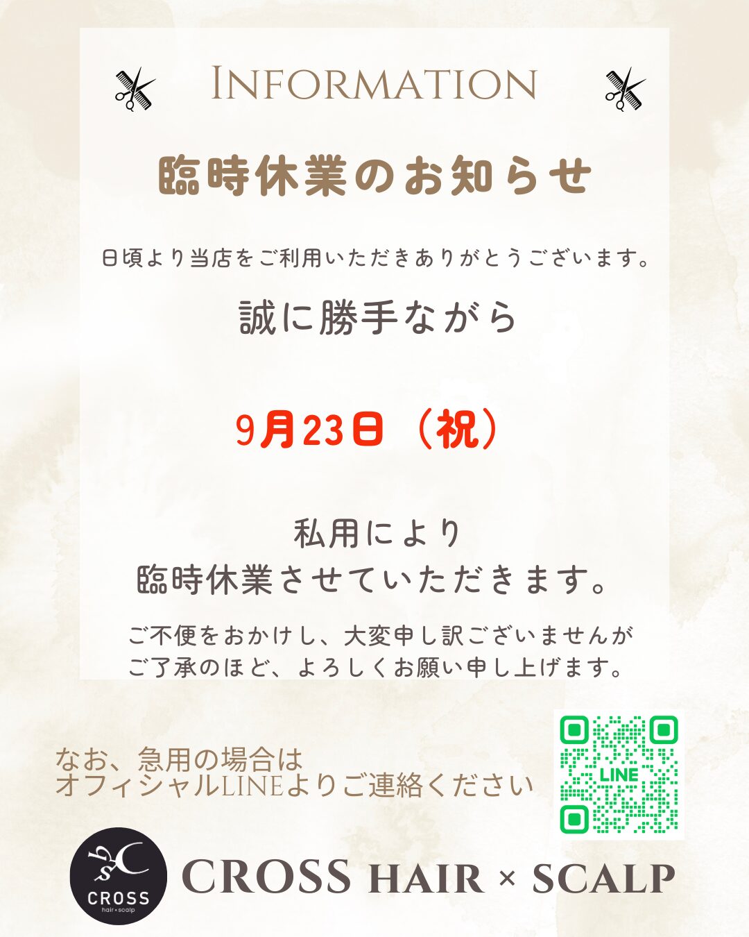 9月23日(祝)は臨時休業とさせていただきます。