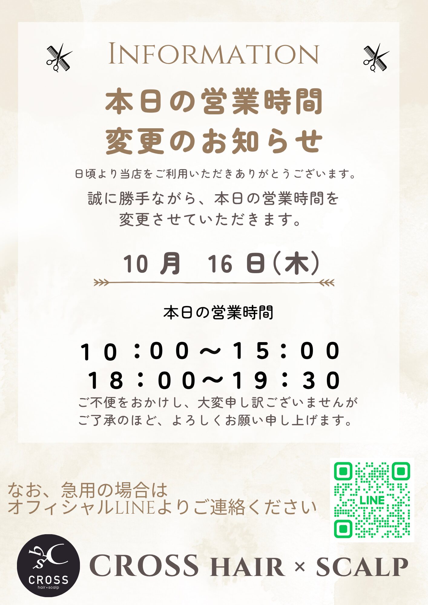 CROSS hair × scalp2025年10月16日10月 16日(木) 営業時間 変更のお知らせ